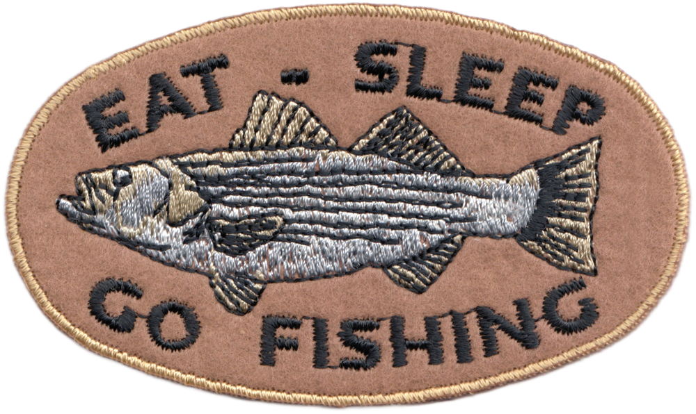 | 3.375" x 1.875" Patch | Eat - Sleep and Go Fishing (Oval Logo with Striped Bass Fish) | $4.98 | 1-PTR-9933 | ||