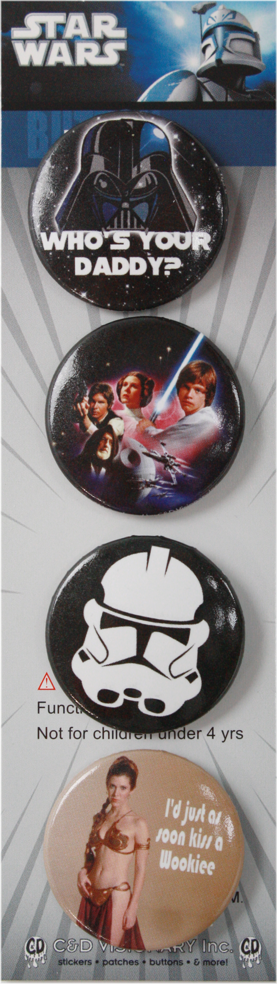 | Button Pack | STAR WARS | 4 Pack of Star Wars 1.25" Buttons - Who's Your Daddy, "I'd Just as soon kiss a wookie" (Princess Leia), Stormtrooper and Group Shot! | $4.99 | 1-LBP-88001 | |